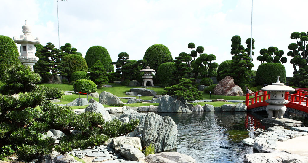Dễ nhận thấy nhất trong các khu vườn nhật là cây xanh và các khối đá với hình dáng tự nhiên đan xen vào nhau. Ở công viên này, tất cả các loại cây vạn niên tùng, bon sai, các khối đá... đều được đem về từ tỉnh Ehime, Nhật Bản.