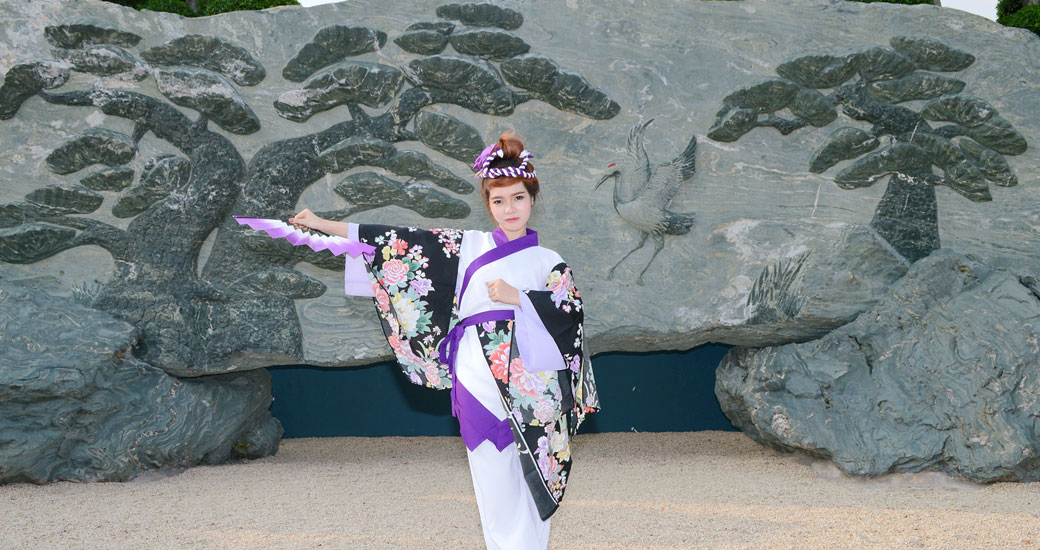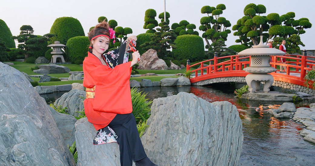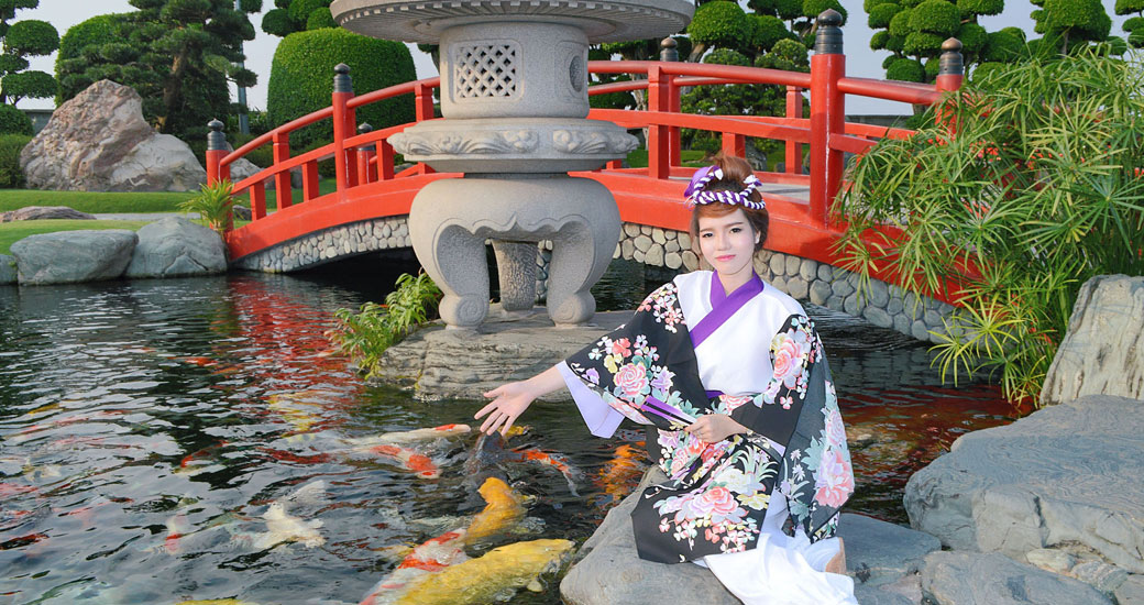 Một hình ảnh không thể thiếu trong công viên Nhật là các thiếu nữ việc trong trang phục Kimono truyền thống Nhật Bản.